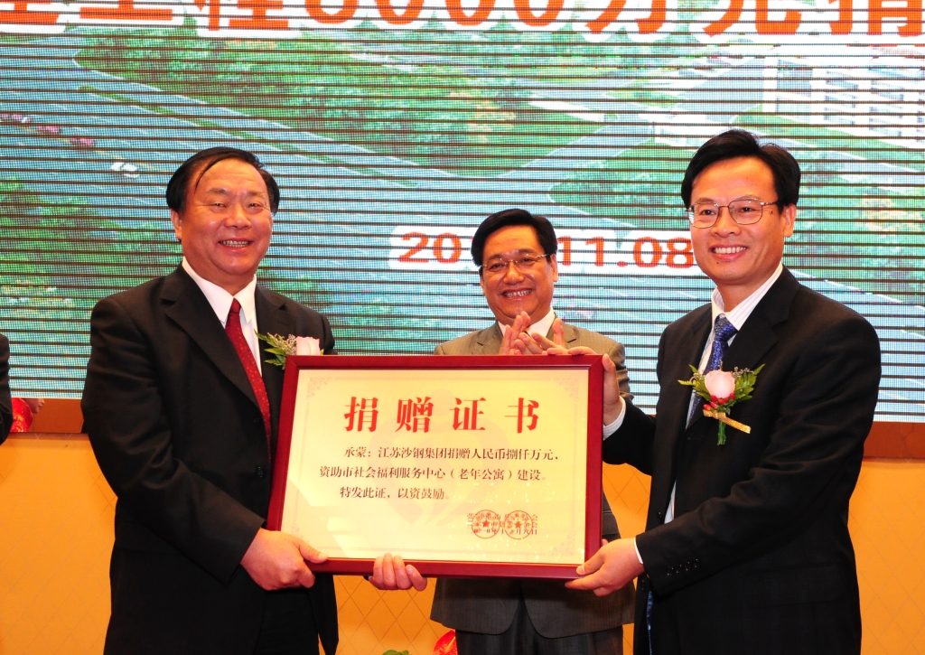2003年“非典”期間,向淮安市政府捐贈10萬元。向淮安市慈善基金會捐款35萬元用于慈善事業(yè)。向淮安市慈善總會捐款100萬元,用于關(guān)愛困難職工和外來務(wù)工人員。2010年,沙鋼集團(tuán)安陽永興公司向河南省安陽縣水治鎮(zhèn)區(qū)殘疾人捐款6萬元。